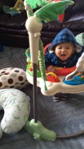 Jackson used to prance in his Jumparoo by sequentially jumping off one foot then the other. It was light and graceful.