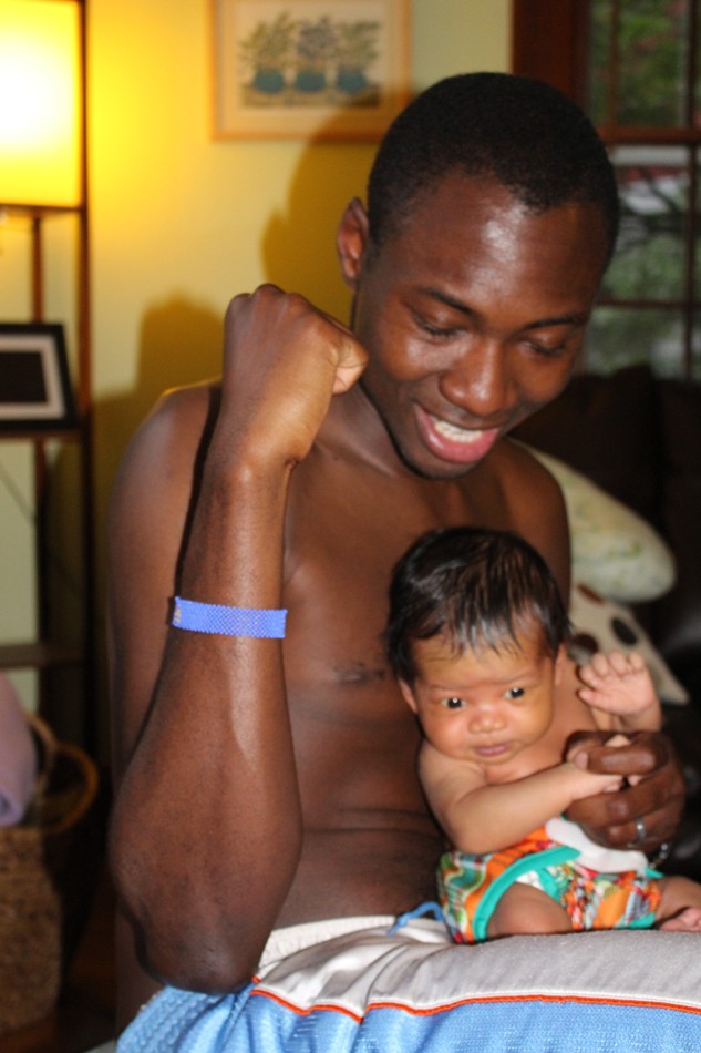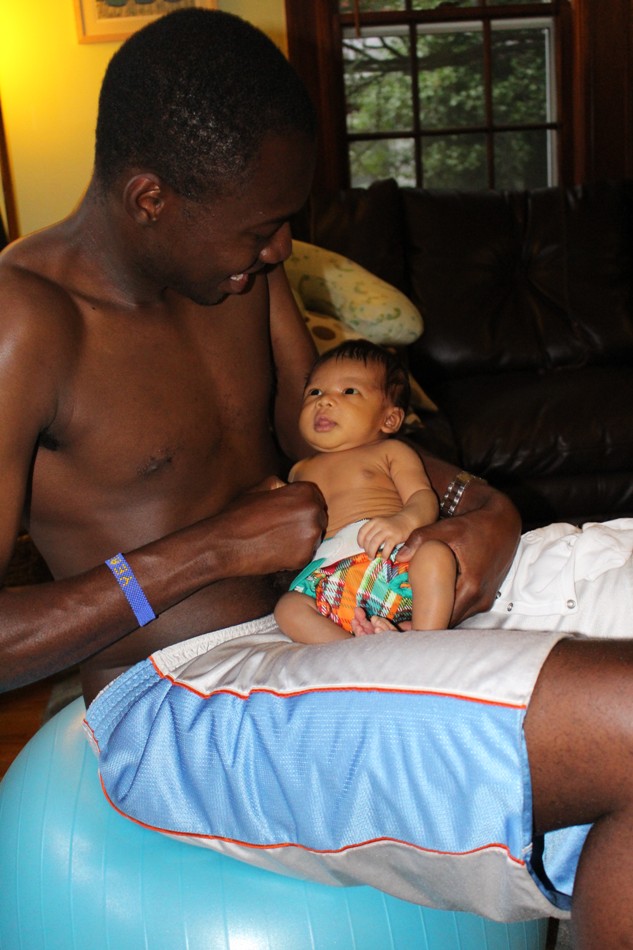 2 weeks old- Sun’s out, guns out. Joe used to throw his shirt off at the first sign of hot weather on the Bowdoin quad. Here he’s teaching l’il jackson how to deal with the heat and show off some muscle!!